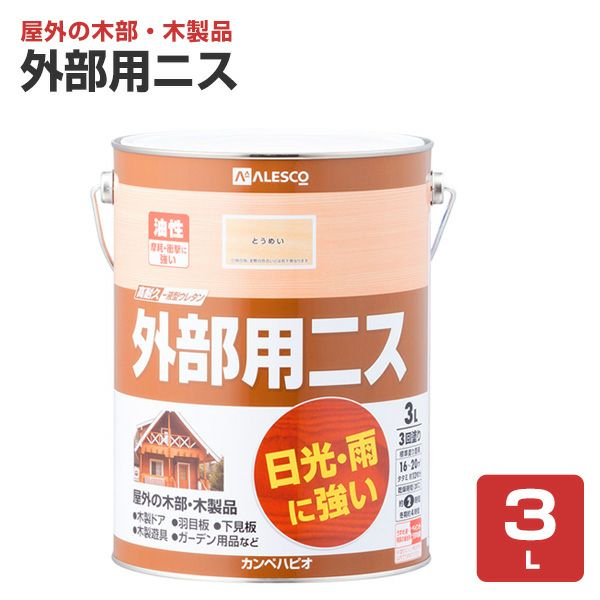 他の画像を見る 屋外で使用できる耐候性のある外部用ニスです。ペンキ/塗料 カンペハピオ 外部用ニス とうめい 3L 販売価格 ¥ 6,600 税込 会員価格 ¥ 6,400 税込 カートに入れる お気に入りに登録する (0)