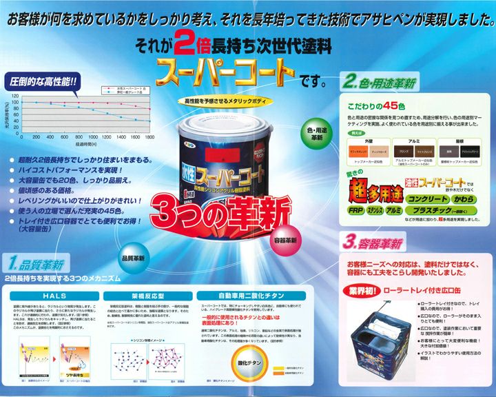 他の画像を見る 屋内外の木部からアルミ・トタン、モルタル・コンクリート壁まで!超耐久の2倍長持ち多用途塗料。 油性スーパーコート 10L(アサヒペン) 販売価格 ¥ 18,700 税込 会員価格 ¥ 17,050 税込 詳細を見る お気に入りに登録する (0)