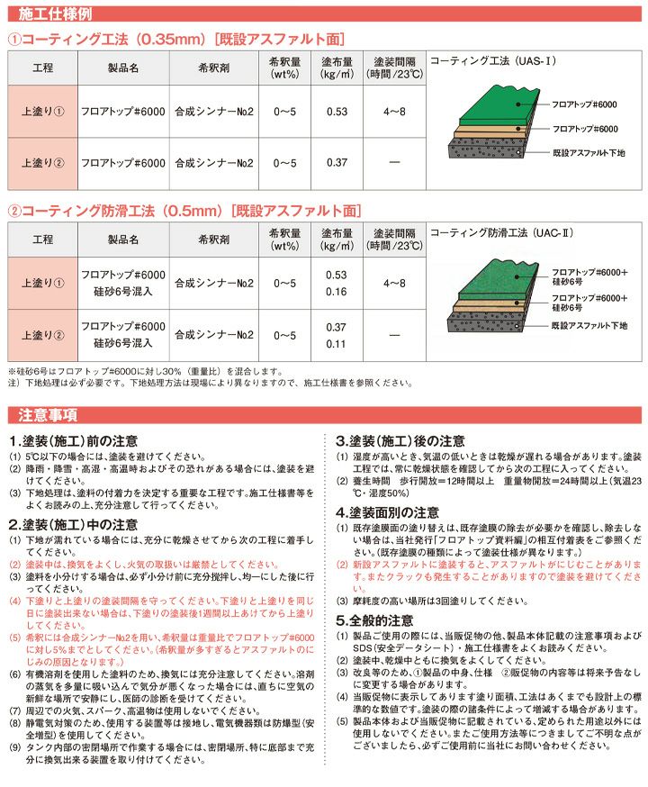 ●アスファルトのブリードが少なく、鮮明な色調です。●既設アスファルトとの付着性が良く、直塗りできます。●耐摩耗性に優れています。●施工が容易です。
