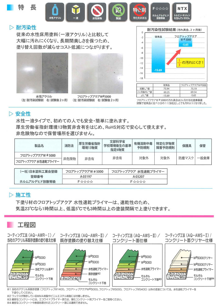 長期間汚れにくい水性床用塗料!フロアトップ#5000の水性タイプで、工場事務所、倉庫通路、店舗などに最適です。
