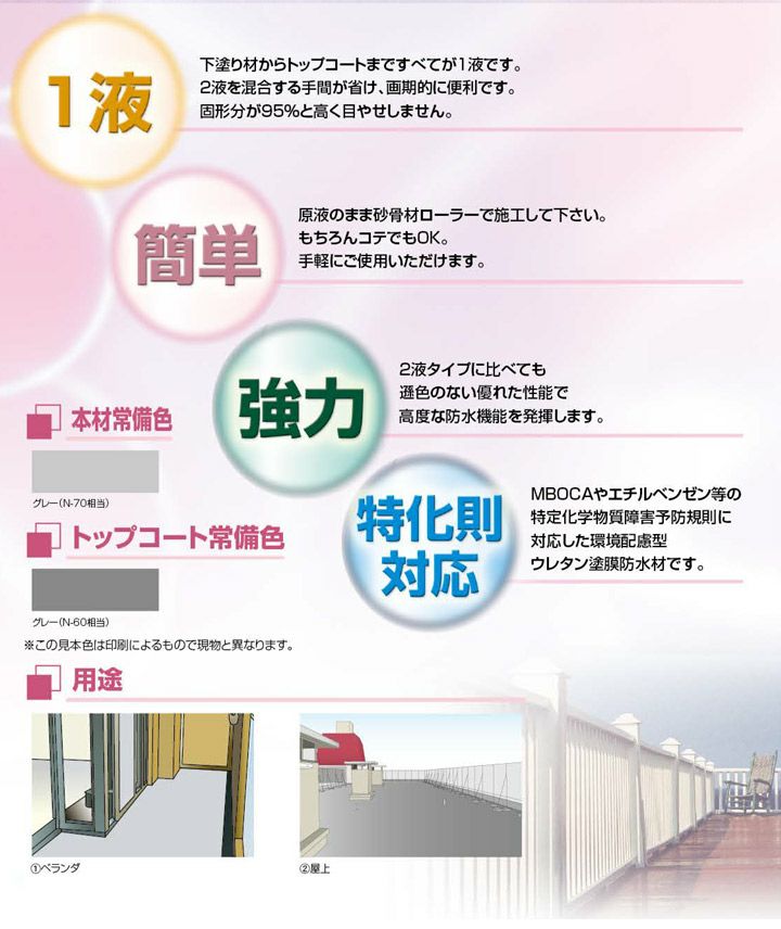 他の画像を見る ベランダ、バルコニー、屋上(陸屋根)、開放廊下等の防水および美装に最適なウレタン防水材! フローン01 X 本材・立上がり用 グレー 10kg (東日本塗料/ウレタン防水材/一液/油性) 販売価格 ¥ 16,940 税込 会員価格 ¥ 16,500 税込 カートに入れる お気に入りに登録する (0)