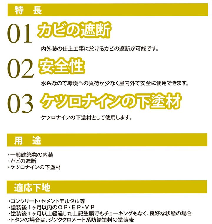 他の画像を見る ★ケツロナイン下塗り材(水系防藻・防カビ用下塗材) カビフージA(水系) 17kg (菊水化学工業) 販売価格 ¥ 15,400 税込 会員価格 ¥ 14,850 税込 カートに入れる お気に入りに登録する (0)
