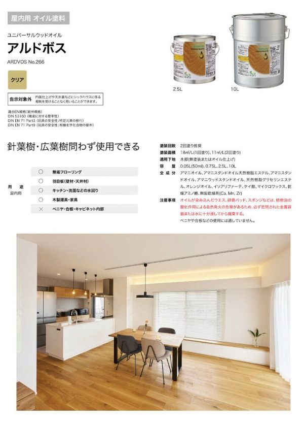 他の画像を見る ★針葉樹・広葉樹問わず使用できるクリアオイル! 【P10倍!】 リボス アルドボス No.266 クリア 10L (室内用オイル 自然健康塗料 無垢フローリング 羽目板 キッチン・洗面などの水回り 木製建具・家具 プレイリーホームズ) 販売価格 ¥ 51,700 税込 会員価格 ¥ 50,600 税込 カートに入れる お気に入りに登録する (0)