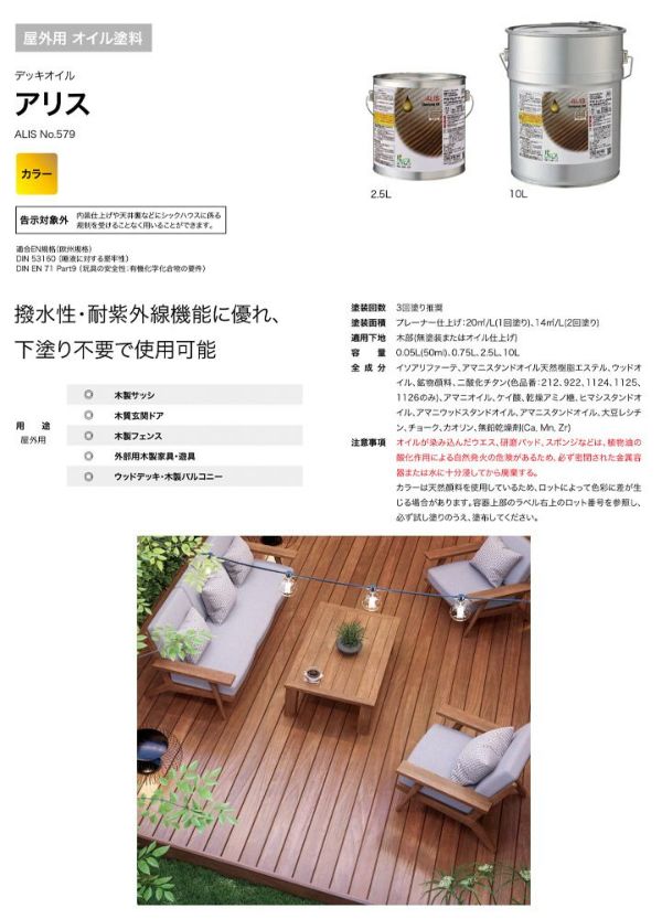 他の画像を見る ★下塗り不要な屋外木部用デッキオイル! 【P10倍!】 リボス アリス No.579 全12色 10L (屋外用オイル 自然健康塗料 木製サッシ 木質玄関ドア 木製フェンス 外部用木製遊具 ウッドデッキ・木製バルコニー プレイリーホームズ) 販売価格 ¥ 66,000 税込 会員価格 ¥ 63,800 税込 詳細を見る お気に入りに登録する (0)