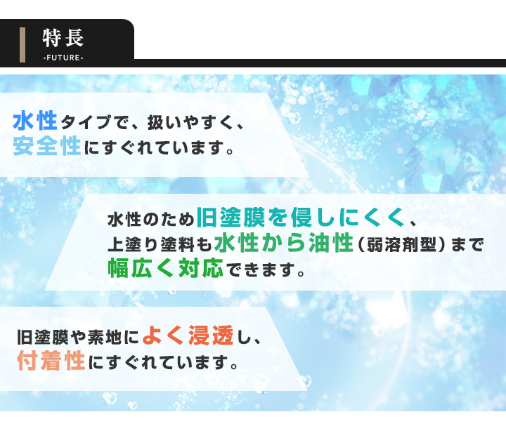 ●水性のため旧塗膜を侵しにくく、上塗り塗料も水性から油性(弱溶剤型)まで幅広く対応できます。