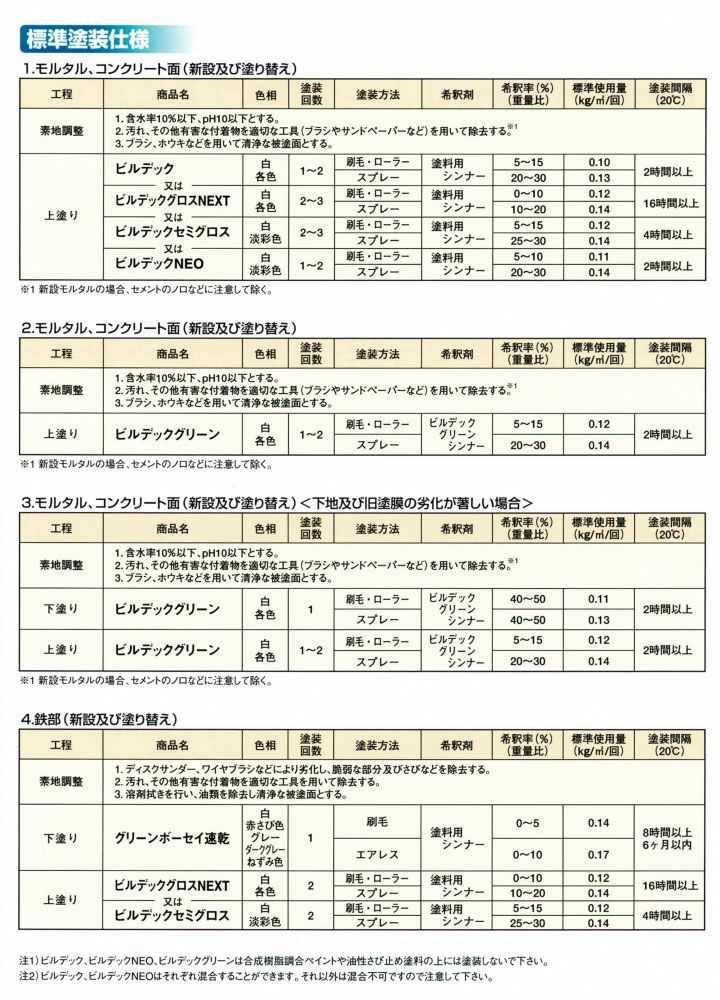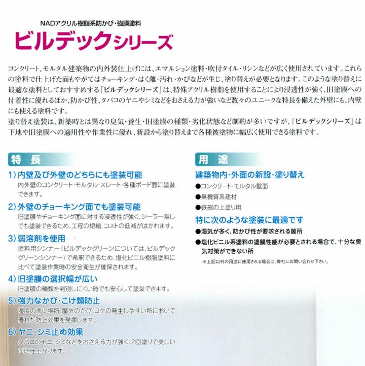 他の画像を見る 防かび性、ヤニ・シミ抑え効果、浸透性が強く、旧塗膜や多少のチョーキング面にもシーラー無しでも塗装できます。 ビルデック グリーン 白 16kg (微臭性防カビ・強膜塗料/大日本塗料) 販売価格 ¥ 12,650 税込 会員価格 ¥ 12,280 税込 カートに入れる お気に入りに登録する (0)
