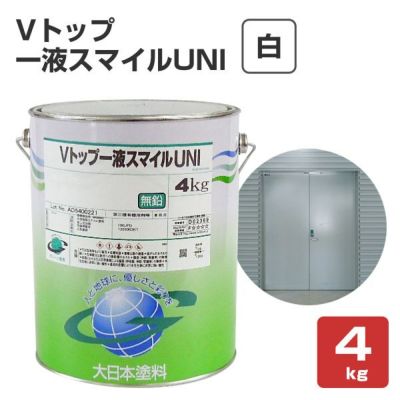 壁面からドア・手すりなどの鉄部や雨樋などの硬質塩ビも塗装可能な弱溶剤系一液反応硬化形ウレタン樹脂塗料! Vトップ一液スマイルUNI 白 4kg (弱溶剤一液反応硬化形ウレタン樹脂塗料)