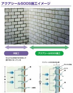アクアシール500Sは、シリコーン系浸透性吸水防止材です。タイル・石材およびモルタル目地に吸水防止機能を付与させることにより、劣化、凍害、汚れ、白華(エフロレッセンス)を抑制します。