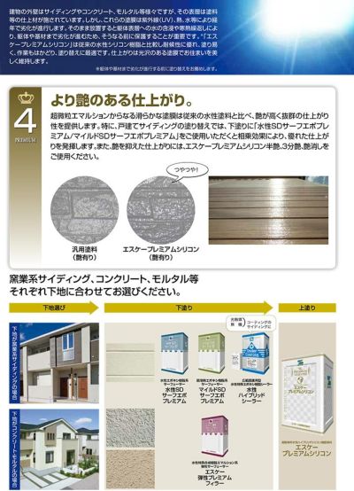エスケー化研のエスケープレミアムシリコンは、超耐候形水性ハイブリッドシリコン樹脂塗料で、超耐候形特殊ハイブリッドシリコン樹脂を採用しており、これまでのシリコン樹脂を超えるハイレベルな耐候性を発揮します。メンテナンスサイクルは14~16年と長く結果的にメンテナンスコストがお得になります。