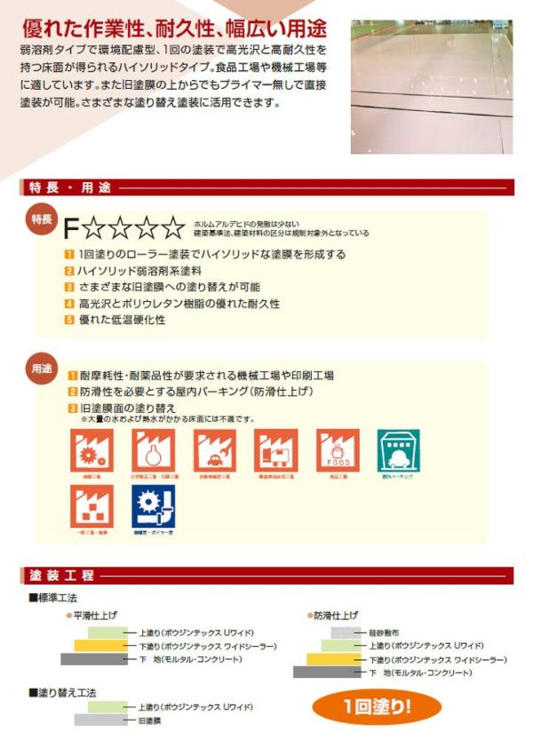 他の画像を見る 1回の塗装で高光沢と高耐久性を持つ床面が得られるハイソリッドタイプの2液ポリウレタン樹脂塗料! ボウジンテックス Uワイド 4kgセット(水谷ペイント 床塗料 工場 倉庫 駐車場 ) 販売価格 ¥ 10,670 税込 カートに入れる お気に入りに登録する (0)