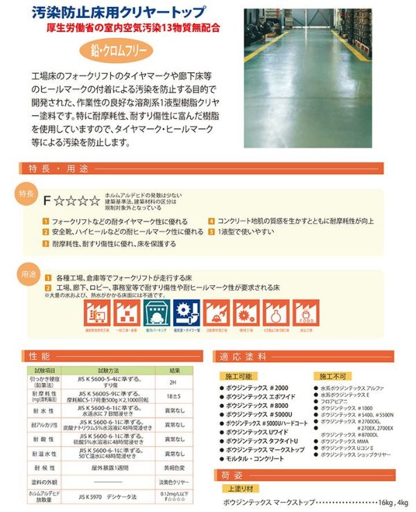 他の画像を見る ★汚染防止用クリアーコート! ボウジンテックス マークストップ 4kg (水谷ペイント/油性/ウレタン/塗料/床用/上塗り/工場/倉庫) 販売価格 ¥ 9,900 税込 カートに入れる お気に入りに登録する (0)