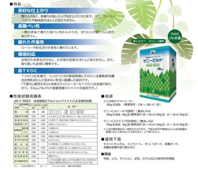 TVOC1%未満で、シックハウスの原因物質とされている揮発性有機化合物をほとんど含まない安全に配慮した設計です。(下塗りに使用するSK水性ホワイトシーラーもTVOC1%未満であり、かつ、ホルムアルデヒド放散等級 F☆☆☆☆の設計です。)