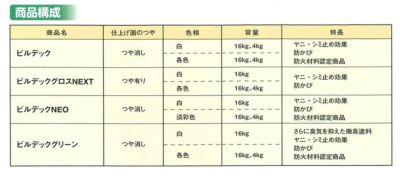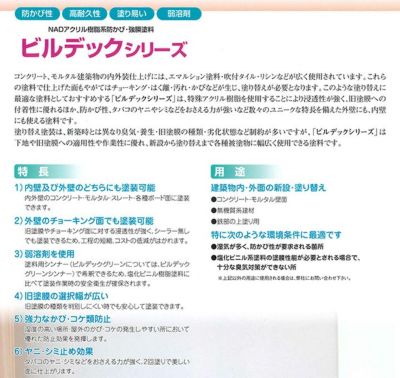 防かび性、ヤニ・シミ抑え効果、浸透性が強く、旧塗膜や多少のチョーキング面にもシーラー無しでも塗装できます。 ビルデック 白 16kg (低臭/弱溶剤強膜塗料/大日本塗料)