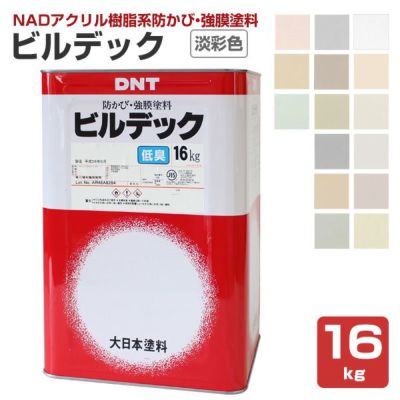 防かび性、ヤニ・シミ抑え効果、浸透性が強く、旧塗膜や多少のチョーキング面にもシーラー無しでも塗装できます。 ビルデック 淡彩色 16kg (低臭/弱溶剤アクリル樹脂系強膜塗料/大日本塗料)