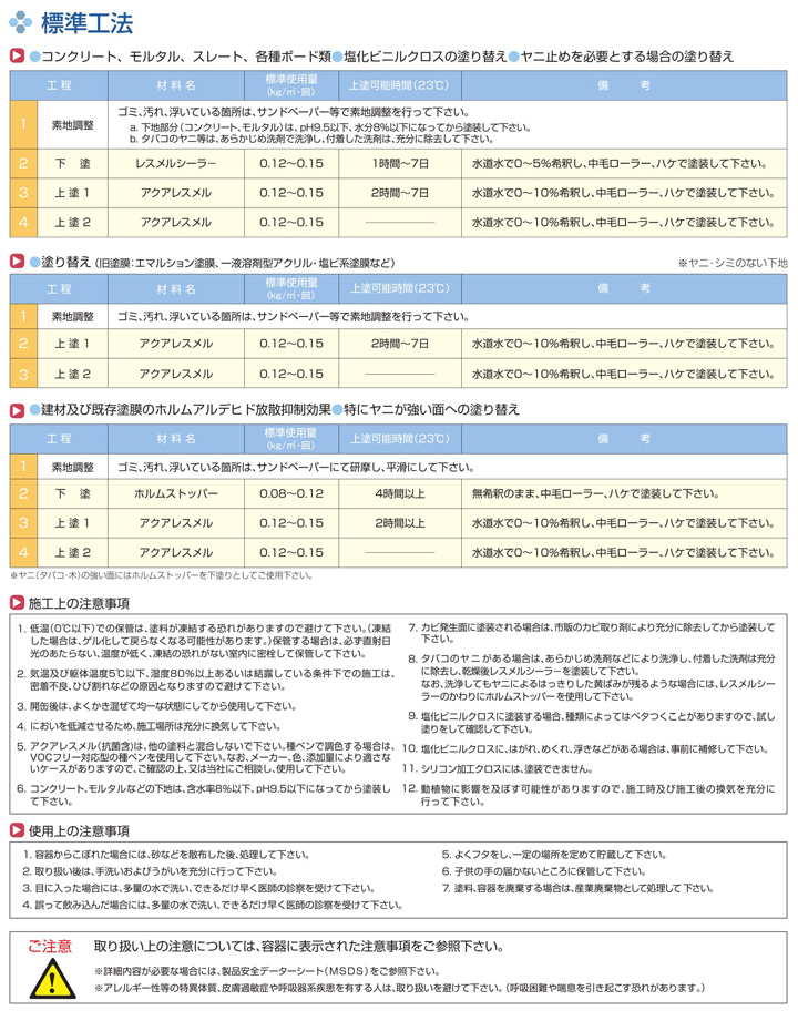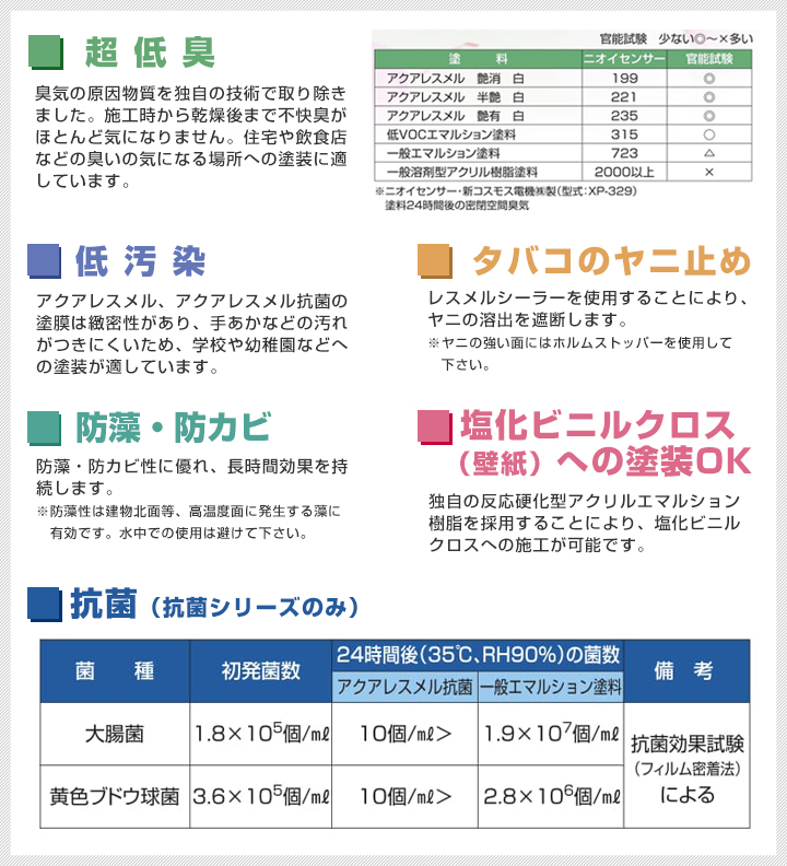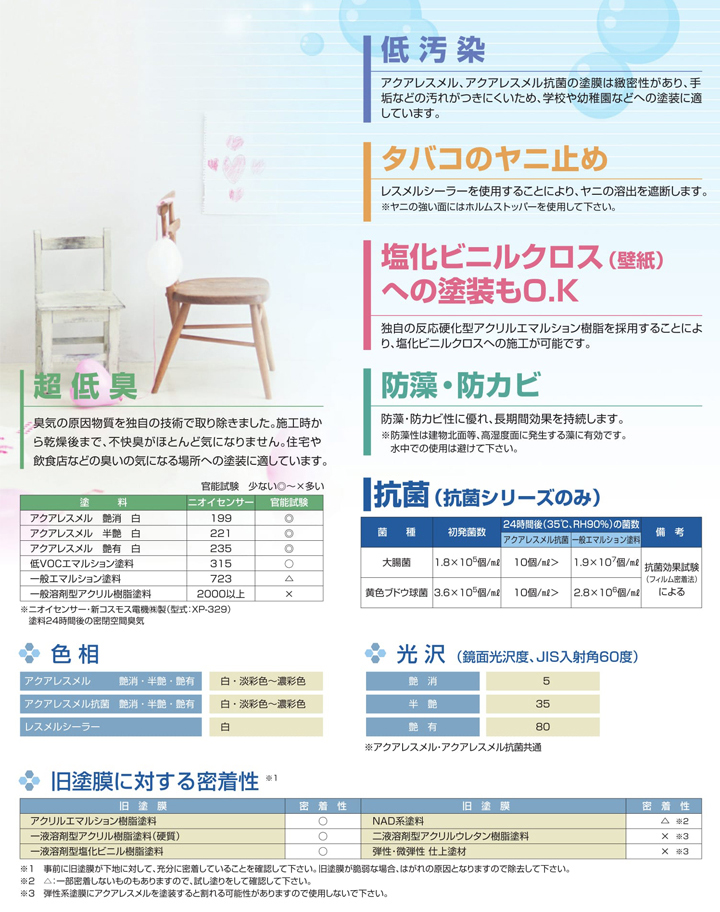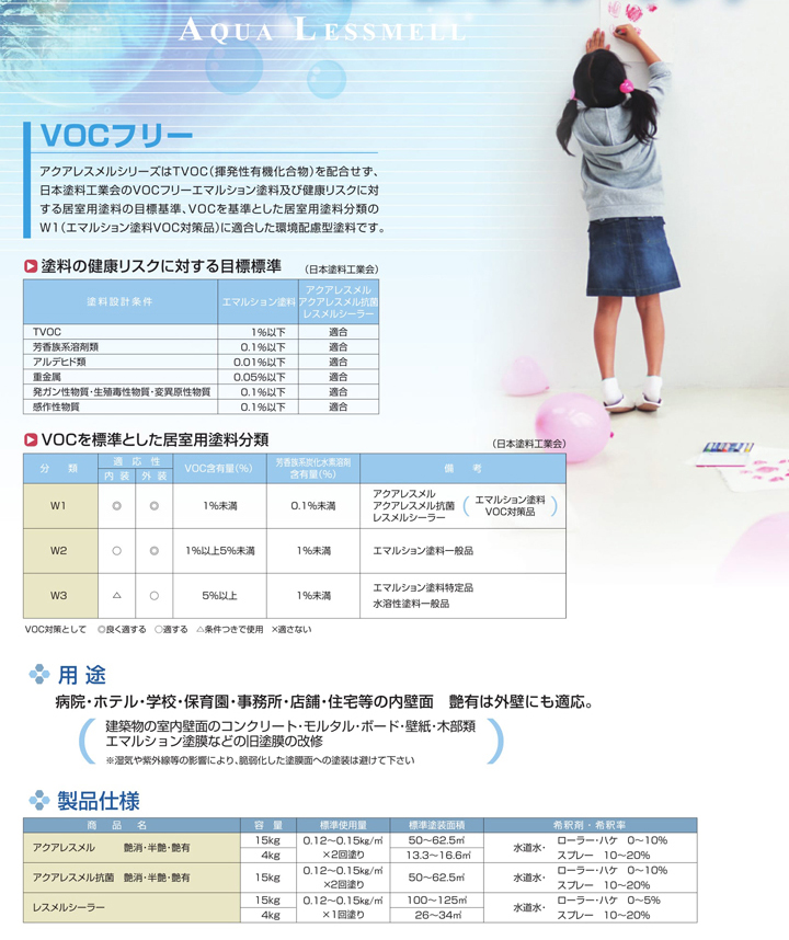 東日本塗料のアクアレスメルは、TVOC(揮発性有機化合物)を配合せず、日本塗料工業会のVOCフリーエマルション塗料及び健康リスクに対する居室用塗料の目標基準、VOCを基準とした居室用塗料分類のW1(エマルション塗料VOC対策品)に適合した環境配慮型塗料です。