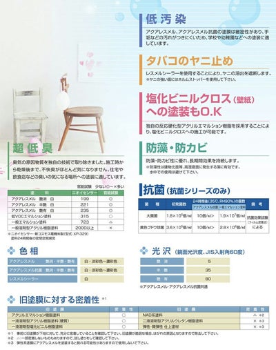 東日本塗料のアクアレスメルは、TVOC(揮発性有機化合物)を配合せず、日本塗料工業会のVOCフリーエマルション塗料及び健康リスクに対する居室用塗料の目標基準、VOCを基準とした居室用塗料分類のW1(エマルション塗料VOC対策品)に適合した環境配慮型塗料です。