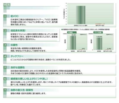 アトミクスのEナンバーエコは、従来のEナンバーシリーズ以上の作業性、仕上がり性に加え超低臭・つや消しは絹感覚の美しい仕上がり・低VOC・抗菌等数々の機能を付加した、環境対応型の水性エマルション塗料です。