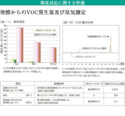 厚生労働省の室内濃度に対する指針値及び日本塗料工業会の健康リスクに対する建築用塗料(エマルション塗料)の目標基準値を達成し、さらにエマルション塗料の常識を変え、塗料配合中にVOC(有機溶剤など)を含有してないのが「ノボクリーンシリーズ」です。