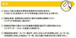 1.安心して使える屋内木部用水性塗料の代名詞と呼ばれ、 T-VOC 0.3%未満のインテリア木部全般に対応する仕上げ剤です。