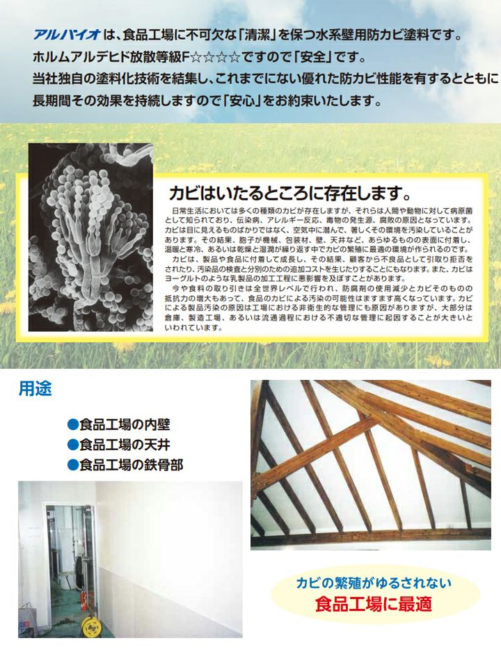 他の画像を見る ★品質的に非常に評価の高い防カビ塗料を日本の市場に合致させ開発した防カビ塗料! アルバイオ 白 4kg (水系壁用防カビ塗料/水谷ペイント) 販売価格 ¥ 6,600 税込 会員価格 ¥ 6,400 税込 カートに入れる お気に入りに登録する (0)