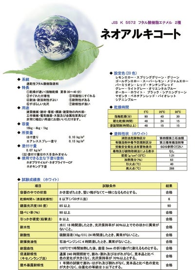川上塗料のネオアルキコート無鉛(速乾性フタル酸樹脂)は、フタル酸樹脂塗料の代表製品で、鉄道車両から建材、看板、工作機械、木材および金属製家具まで広い用途。乾燥時間も短く、付着性に優れ耐油、耐溶剤性、耐熱性があります。塗り放しでも光沢がよく耐候性が極めて優れています。