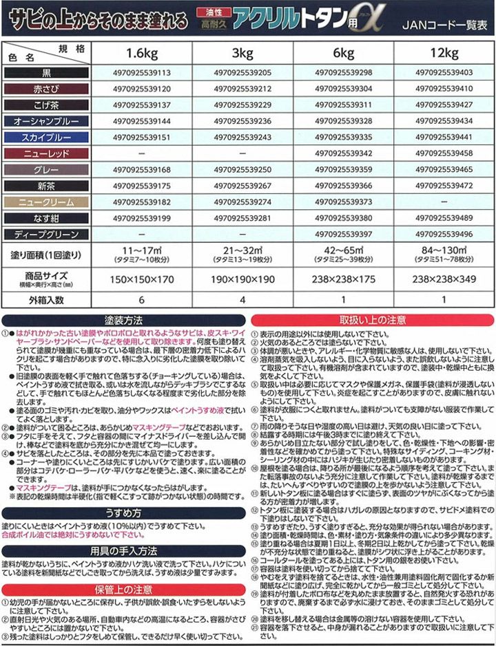 他の画像を見る ★サビの上からそのまま塗れるサビ止め兼用塗料! 油性超耐久シリコンアクリルトタン用スーパー 黒・青系 6kg(アサヒペン/油性/屋根/トタン) 販売価格 ¥ 14,850 税込 会員価格 ¥ 14,300 税込 カートに入れる お気に入りに登録する (0)