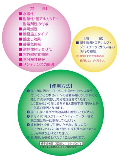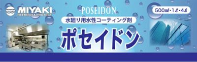 ミヤキのポセイドンは、水廻り用水性コーティング剤です。衛生陶器・ステンレス・プラスチック・ガラス等の汚れを抑制します。