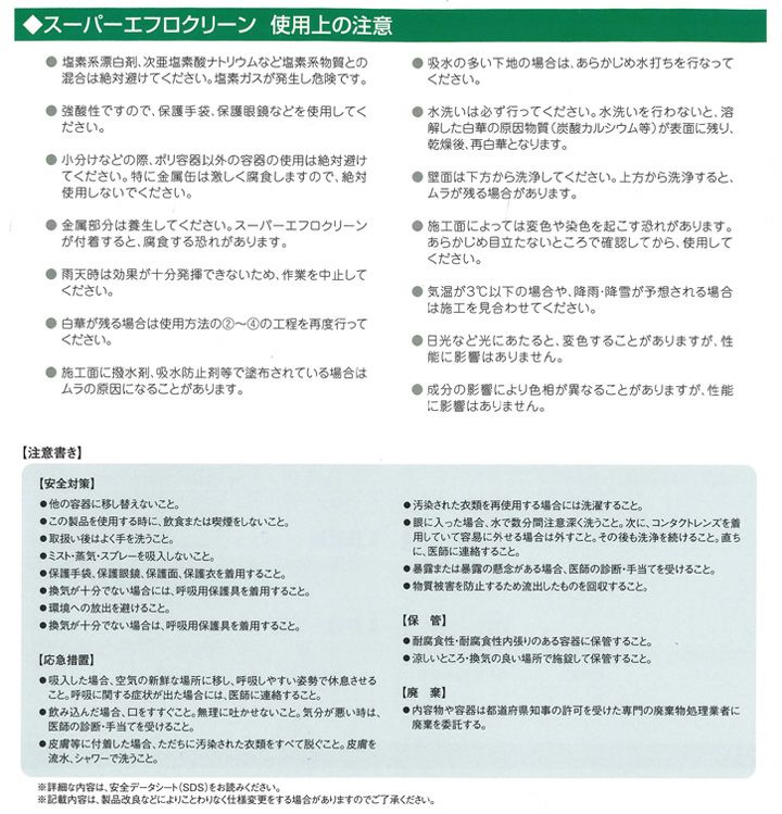 他の画像を見る ★モルタル、コンクリート、磁器タイルなどの白華除去に! 【業務用】 強力白華除去剤 スーパーエフロクリーン 5L (ヤブ原産業) 販売価格 ¥ 12,100 税込 会員価格 ¥ 11,000 税込 カートに入れる お気に入りに登録する (0)