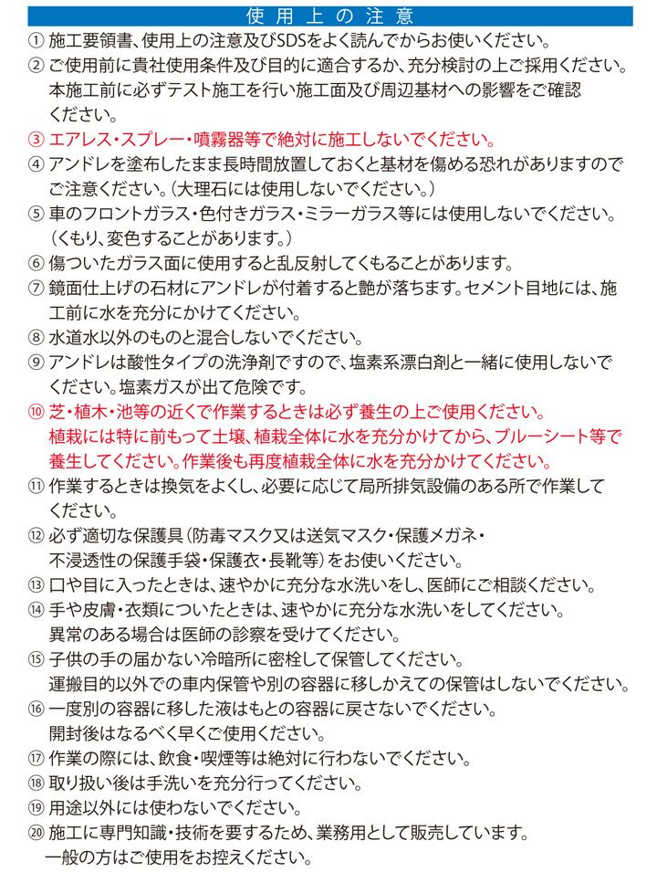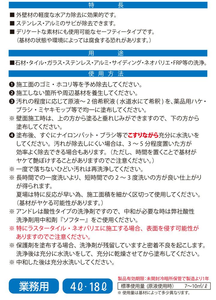 他の画像を見る 【業務用】酸性タイプの強力エフロ落し剤!温泉スケール除去にも最適。石材用洗浄剤 ミヤキ ビートル 18L (石材用洗浄剤/酸性タイプ/エフロ/白華/業務用) 販売価格 ¥ 27,500 税込 会員価格 ¥ 26,670 税込 カートに入れる お気に入りに登録する (0)