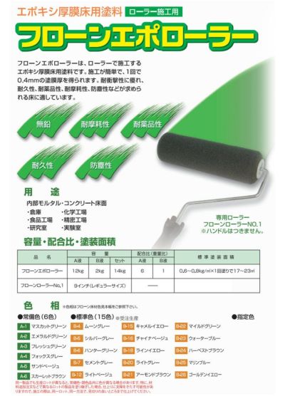ローラーで施工するエポキシ厚膜床用塗料です。施工が簡単で、1回で0.4mmの膜厚が得られます。2液エポキシ厚膜床用塗料 フローンエポローラー 常備色 14kgセット (2液エポキシ厚膜床用塗料/東日本塗料)