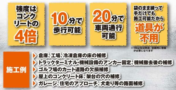 他の画像を見る ★工場や倉庫、冷凍倉庫等の床補修に最適! ヤブ原産業 マッハコン 3kg×4袋 (超速硬高強度コンクリート補修材 欠損補修材 床用) 販売価格 ¥ 15,950 税込 会員価格 ¥ 15,400 税込 カートに入れる お気に入りに登録する (0)