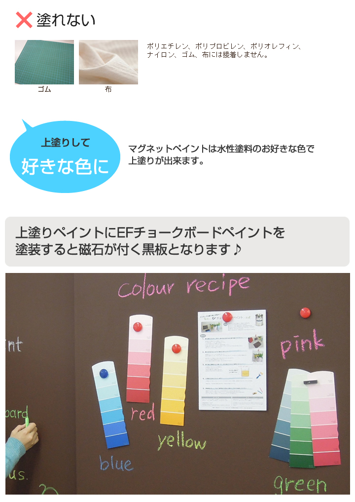 マグネットペイントは、ほとんどの壁面(MDF以外)に驚くほど多様な磁石の使い方を可能にする水性エマルション塗料です。 塗料の中には錆びないように加工した鉄の微粒子が含まれておりますので、 乾燥後は磁石の付く壁面が出来上がります。 その磁力は塗り重ねた層の厚さと使われる磁石の大きさや強さによって 決まります。