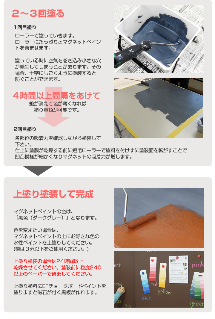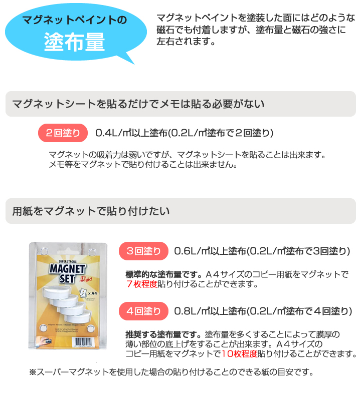 マグネットペイントは、鉄粉層を規定の膜厚塗り重ねることで本来の機能を発揮いたします。 施工面積に対してご注文数量が少ない場合は、本来の機能が発揮できないことが予測されますのでご注文品又はご注文数量が、ご予定の施工面積に足りる数量かどうかを事前にご確認願います。