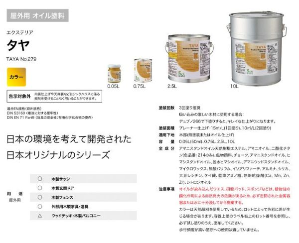 他の画像を見る ★日本の環境にマッチした日本オリジナルシリーズ! 【P10倍!】 リボス タヤ No.279 全15色 2.5L (屋外用オイル 自然健康塗料 木製サッシ 木質玄関ドア 木製フェンス 外部用木製遊具 プレイリーホームズ) 販売価格 ¥ 20,570 税込 会員価格 ¥ 19,800 税込 詳細を見る お気に入りに登録する (0)