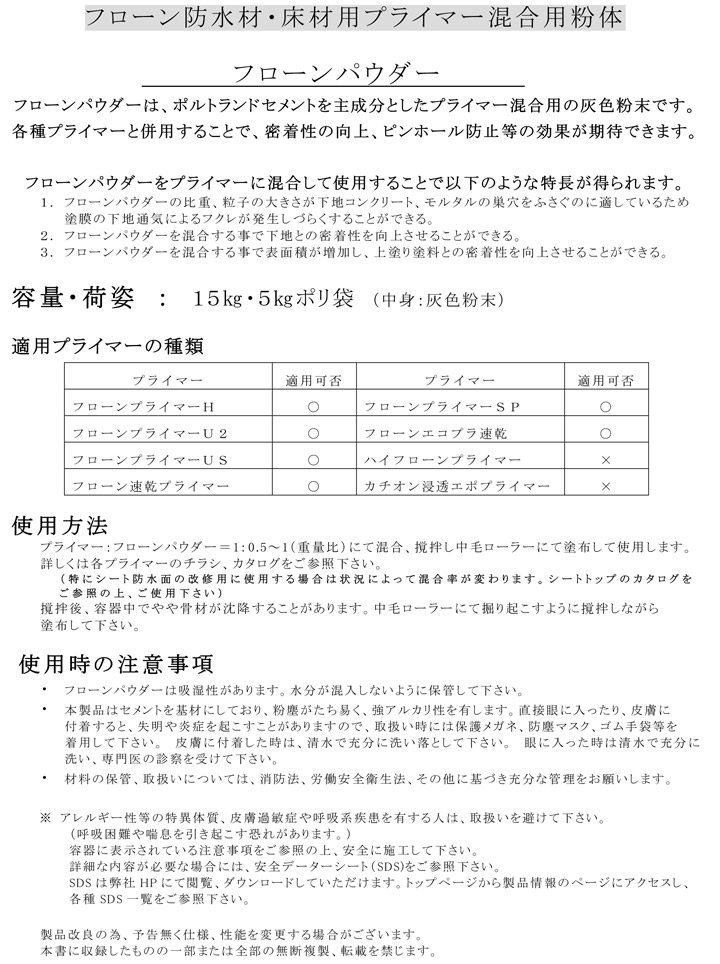 東日本塗料のフローンパウダーは、ポルトランドセメントを主成分としたプライマー混合用の灰色粉末です。 各種プライマーと併用することで、密着性の向上、ピンホール防止等の効果が期待できます。