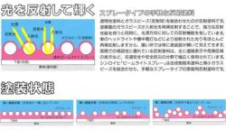 シンロイヒのビームライトスプレーは、透明性塗料とガラスビーズ(反射球)を組み合わせた反射塗料です。塗膜面のガラスビーズが入射光を再帰反射することで、強力な反射性能を持つと同時に、光源方向に対しての反射機能を有しています。