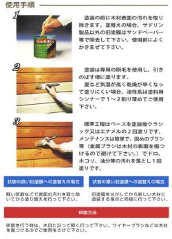 ・塗装の前に木材表面の汚れを取り除いて下さい。また塗り替えの場合、サドリン製品以外の旧塗膜はサンドペーパー等で除去して下さい。