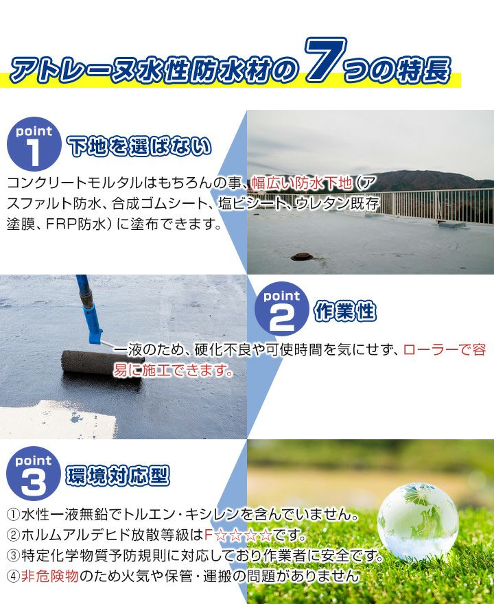 他の画像を見る 水性ウレタン防水材!屋上・ベランダ・バルコニーなどの防水に最適 【P10倍!】 アトレーヌ水性トップSG 15kg (アトミクス) 販売価格 ¥ 21,780 税込 会員価格 ¥ 21,450 税込 カートに入れる お気に入りに登録する (0)