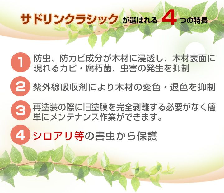 他の画像を見る 厳しい気象条件に強い低塗膜形成型木材保護塗料! 【P10倍!】 サドリン クラシック 各色 16L (玄々化学工業) 販売価格 ¥ 49,610 税込 会員価格 ¥ 48,400 税込 詳細を見る お気に入りに登録する (0)
