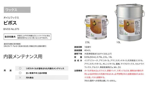 他の画像を見る ★リボスオイル塗装のメンテナンス用ワックス! 【P10倍!】 リボス ビボス No.375 2.5L (オイルワックス WAX メンテナンス用 自然健康塗料 プレイリーホームズ) 販売価格 ¥ 19,250 税込 会員価格 ¥ 18,700 税込 カートに入れる お気に入りに登録する (0)
