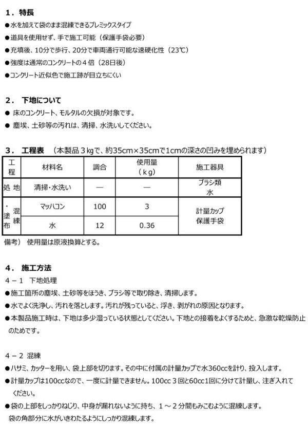 他の画像を見る ★工場や倉庫、冷凍倉庫等の床補修に最適! ヤブ原産業 マッハコン 3kg×1袋 (超速硬高強度コンクリート補修材 欠損補修材 床用) 販売価格 ¥ 5,500 税込 会員価格 ¥ 5,445 税込 カートに入れる お気に入りに登録する (0)