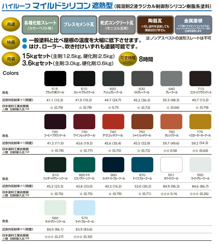 他の画像を見る シーラー、プライマー類の下塗り塗料が不要な屋根用塗料!屋根/弱溶剤/2液型 ハイルーフ マイルドシリコン遮熱型 3.6kgセット (大同塗料/屋根/弱溶剤/2液型) 販売価格 ¥ 14,850 税込 会員価格 ¥ 14,400 税込 詳細を見る お気に入りに登録する (0)