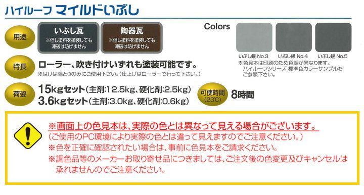 他の画像を見る いぶし瓦、陶器瓦に塗れる屋根用塗料!屋根/弱溶剤/2液型 ハイルーフ マイルドいぶし 3.6kgセット (大同塗料/屋根/弱溶剤/2液型) 販売価格 ¥ 14,850 税込 会員価格 ¥ 14,400 税込 詳細を見る お気に入りに登録する (0)