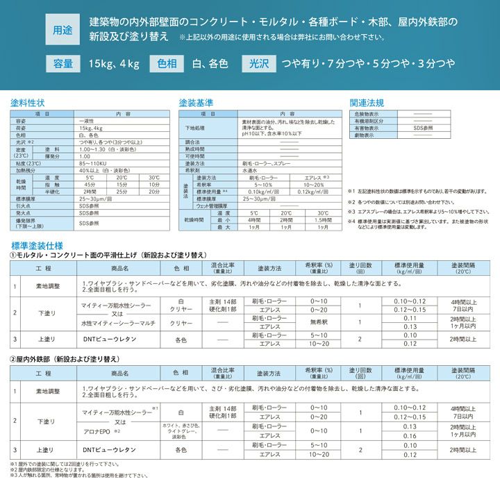 他の画像を見る 防カビ性、透湿性、微臭性、安全性、高耐候性など様々な長所を備えた多機能・多用途塗料 DNTビューウレタン 艶有 白 4kg(一液水性ウレタン塗料/大日本塗料) 販売価格 ¥ 8,250 税込 会員価格 ¥ 8,000 税込 カートに入れる お気に入りに登録する (0)