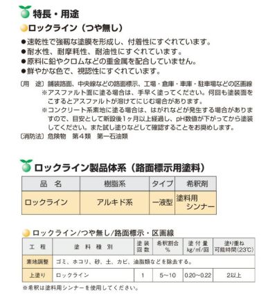 ロックラインは、舗装路面や工場、車庫、駐車場などの区画線に常温で施工できるトラフィックペイントで、アルキド樹脂をベースに作られた路面標示用塗料です。