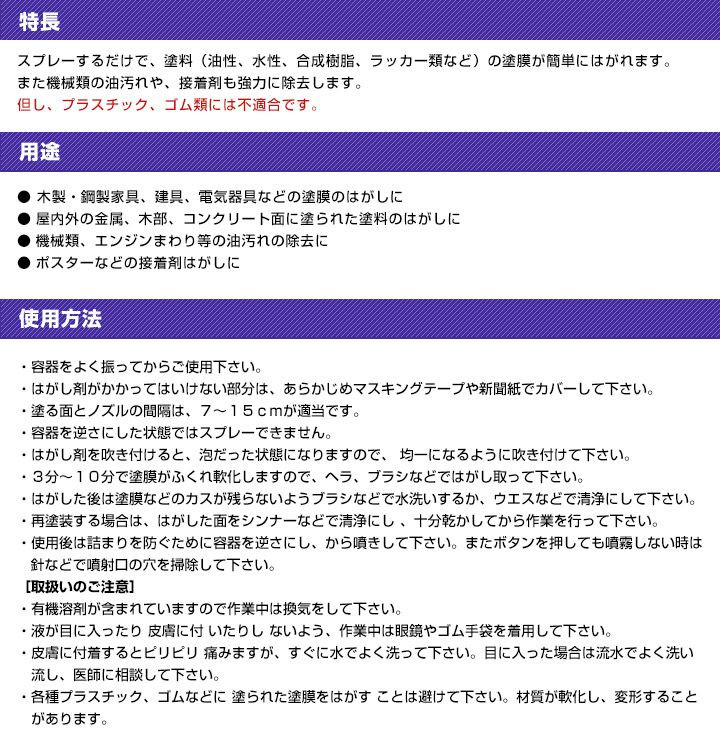 他の画像を見る 油性・水性・合成樹脂・ラッカー類の塗料の塗膜が簡単にはがれるスプレータイプの剥離剤 リムーバーZ 420ml (139828/強力はがし剤スプレー/シントーファミリー) 販売価格 ¥ 1,650 税込 会員価格 ¥ 1,628 税込 カートに入れる お気に入りに登録する