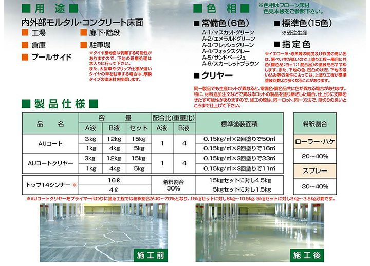 他の画像を見る 屋内外のコンクリート床に使用できるアクリルウレタン樹脂床用塗料!薄膜床用塗料 AUコート クリヤー 15kgセット (薄膜床用塗料/東日本塗料) 販売価格 ¥ 26,840 税込 会員価格 ¥ 26,030 税込 カートに入れる お気に入りに登録する