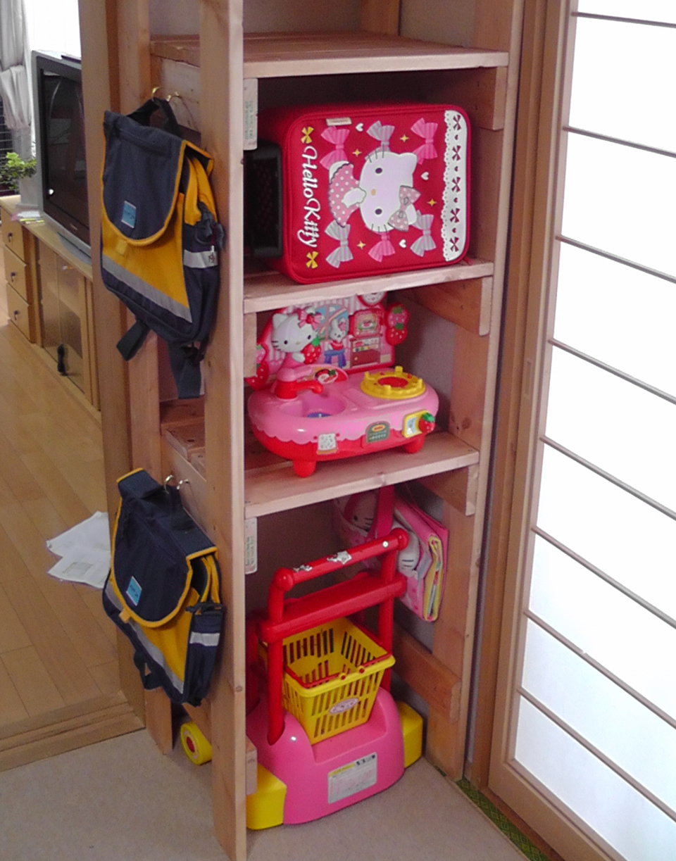 狭い家で広く遊んでもらうために収納棚は欠かせない!