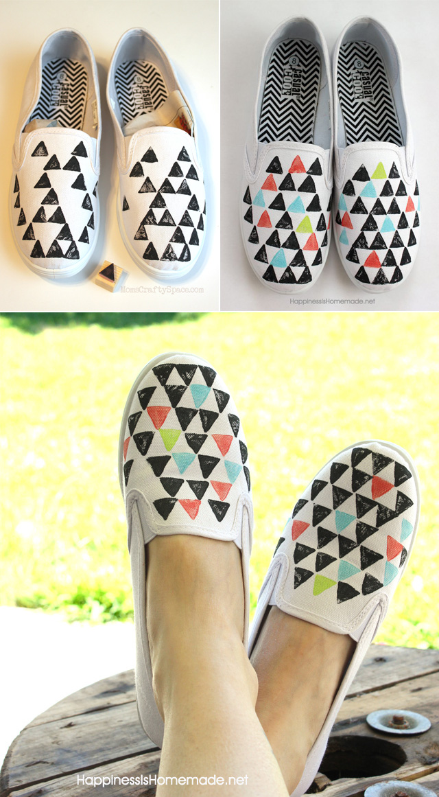 単純な図形を並べてスタンプするだけでも、とってもかわいいスリッポンの出来上がりです。